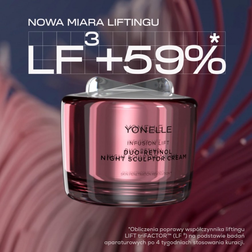 Krem na noc o działaniu skutecznej terapii liftingującej z DUO-RETINOLEM dla każdego typu cery dojrzałej z widocznymi oznakami starzenia, także zmęczonej i pozbawionej blasku. Zaawansowana formuła intensywnie pobudza syntezę kolagenu, wzmacnia barierę ochronną skóry i skutecznie redukuje zmarszczki. Rano cera wygląda na bardziej napiętą, gładszą i rozświetloną, a rysy twarzy stają się wyraźnie bardziej harmonijne. Poj.55ml