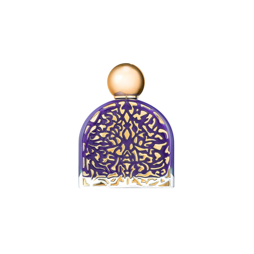 Flakon w głębokim odcieniu fioletu ozdobiony złotem przypomina klejnot, nawiązując do rzemieślniczego i jubilerskiego doświadczenia M. Micallef.